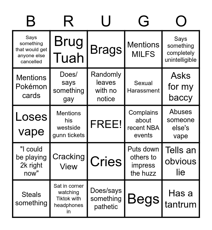 This bingo card has a free space and 24 words: Cracking View, Sat in corner watching Tiktok with headphones in, Randomly leaves with no notice, Steals something, Says something completely unintelligible, Says something that would get anyone else cancelled, Mentions Pokémon cards, Brug Tuah, Complains about recent NBA events, Cries, Sexual Harassment, Loses vape, Puts down others to impress the huzz, Tells an obvious lie, Does/ says something gay, Begs, Abuses someone else's vape, Brags, Asks for my baccy, Mentions his westside gunn tickets, Has a tantrum, "I could be playing 2k right now", Mentions MILFS and Does/says something pathetic.