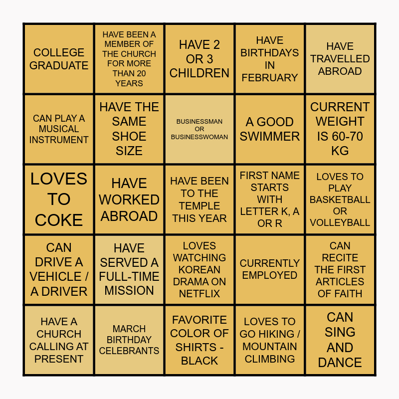 This bingo card has a free space and 24 words: HAVE SERVED A FULL-TIME MISSION, MARCH BIRTHDAY CELEBRANTS, BUSINESSMAN OR BUSINESSWOMAN, HAVE A CHURCH CALLING AT PRESENT, HAVE TRAVELLED ABROAD, COLLEGE GRADUATE, CAN PLAY A MUSICAL INSTRUMENT, HAVE BEEN A MEMBER OF THE CHURCH FOR MORE THAN 20 YEARS, FIRST NAME STARTS WITH LETTER K, A OR R, LOVES WATCHING KOREAN DRAMA ON NETFLIX, A GOOD SWIMMER, LOVES TO COKE, CURRENTLY EMPLOYED, CAN RECITE THE FIRST ARTICLES OF FAITH, HAVE THE SAME SHOE SIZE, LOVES TO GO HIKING / MOUNTAIN CLIMBING, LOVES TO PLAY BASKETBALL OR VOLLEYBALL, HAVE 2 OR 3 CHILDREN, CURRENT WEIGHT IS 60-70 KG, HAVE WORKED ABROAD, CAN SING AND DANCE, CAN DRIVE A VEHICLE / A DRIVER, HAVE BIRTHDAYS IN FEBRUARY and FAVORITE COLOR OF SHIRTS - BLACK.