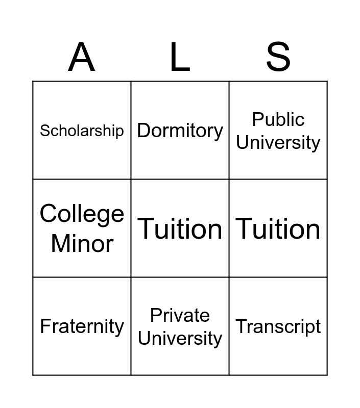 This bingo card has 27 words: Scholarship, Bachelor's Degree, Transcript, Masters Degree, Tuition, Public University, Dormitory, College Major, Undergraduate Student, Sorority, Community College, College Minor, Doctoral Degree, Dining Hall, GPA, Graduate Student, Fraternity, Private University, Sorority, Scholarship, Undergraduate Student, Masters Degree, Doctoral Degree, Private University, Fraternity, Tuition and Transcript.