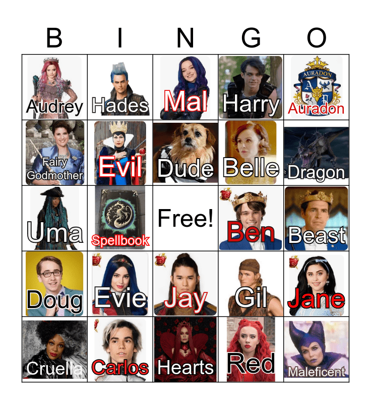 This bingo card has 24 images, a free space and 24 words: Evie, Carlos, Dude, Cruella, Auradon, Audrey, Fairy Godmother, Hades, Ben, Jay, Belle, Uma, Gil, Jane, Evil, Red, Beast, Mal, Dragon, Spellbook, Maleficent, Doug, Harry and Hearts.