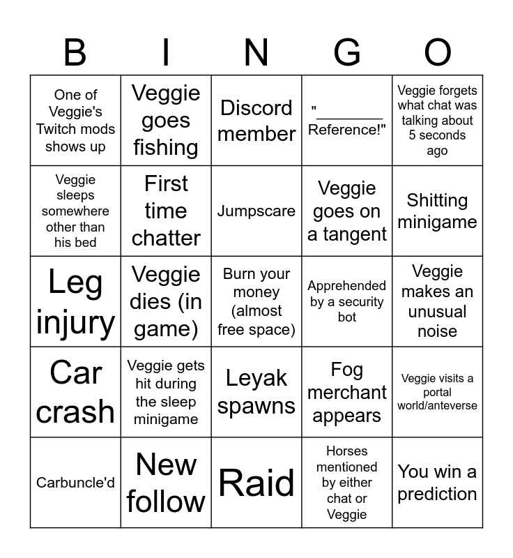 This bingo card has a free space and 41 words: Random accent change, Leg injury, Arch talks about FTL, First time chatter, New follow, Leyak spawns, Jumpscare, Veggie forgets to water his plants, Veggie forgets what chat was talking about 5 seconds ago, Car crash, Veggie dies (in game), "________ Reference!", You win a prediction, Veggie makes an unusual noise, Apprehended by a security bot, Veggie gets hit during the sleep minigame, Mith says something brainrotted, One of Veggie's Twitch mods shows up, You find the secret horse command, Discord member, Veggie visits a portal world/anteverse, Weather event occurs, Raid, Veggie goes on a tangent, 10 viewers or more, Veggie says a word after being banned from saying it, Horses mentioned by either chat or Veggie, Veggie forgets the name of an enemy, Shitting minigame, Veggie throws up from radiation sickness, Soup is created, Veggie goes fishing, Carbuncle'd, Veggie uses a bandage, Fog merchant appears, Veggie sleeps somewhere other than his bed, Htwo/Limmu is streaming at the same time, :3 in chat, Veggie goes to refill his water, Veggie gets an achievement and Base building occurs.