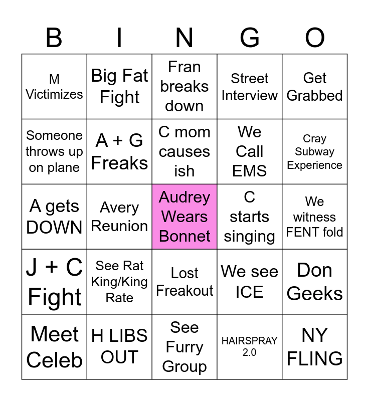 This bingo card has a free space and 24 words: See Rat King/King Rate, H LIBS OUT, C mom causes ish, Meet Celeb, Get Grabbed, M Victimizes, Someone throws up on plane, Big Fat Fight, C starts singing, Lost Freakout, We Call EMS, A gets DOWN, We see ICE, Don Geeks, A + G Freaks, HAIRSPRAY 2.0, We witness FENT fold, Fran breaks down, Cray Subway Experience, Avery Reunion, NY FLING, J + C Fight, Street Interview and See Furry Group.