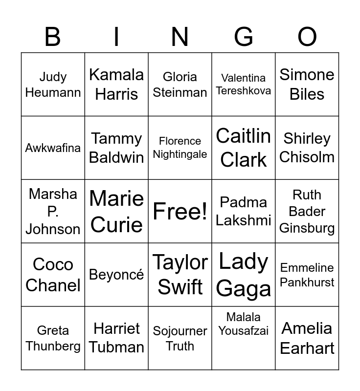 This bingo card has a free space and 24 words: Beyoncé, Harriet Tubman, Florence Nightingale, Greta Thunberg, Simone Biles, Judy Heumann, Awkwafina, Kamala Harris, Padma Lakshmi, Taylor Swift, Caitlin Clark, Marsha P. Johnson, Lady Gaga, Emmeline Pankhurst, Tammy Baldwin, Malala Yousafzai, Ruth Bader Ginsburg, Gloria Steinman, Shirley Chisolm, Marie Curie, Amelia Earhart, Coco Chanel, Valentina Tereshkova and Sojourner Truth.