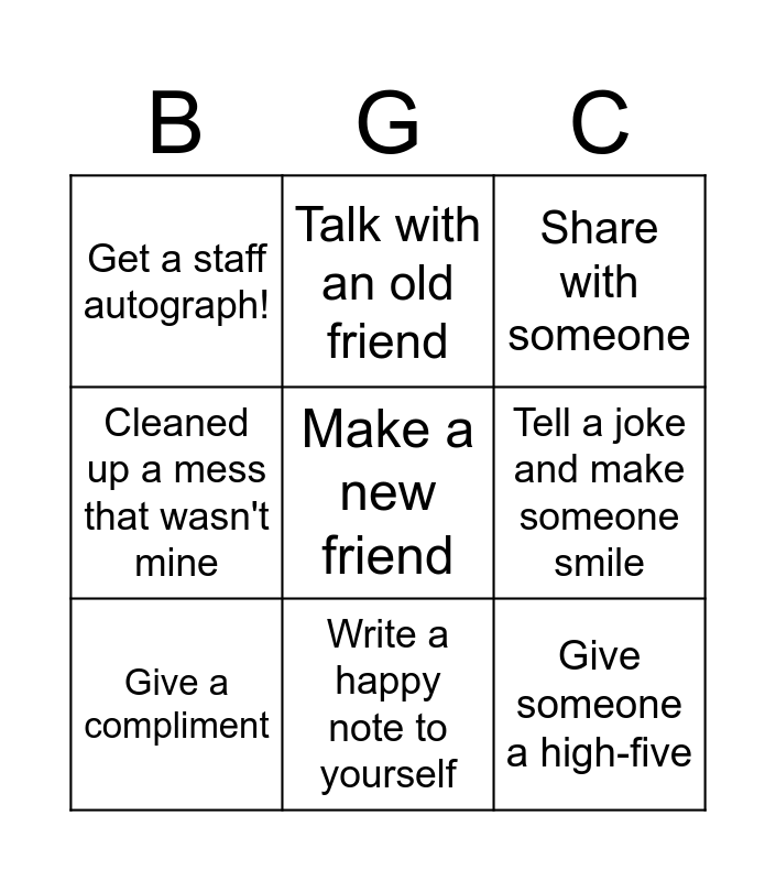 This bingo card has 9 words: Give a compliment, Share with someone, Talk with an old friend, Cleaned up a mess that wasn't mine, Get a staff autograph!, Tell a joke and make someone smile, Make a new friend, Give someone a high-five and Write a happy note to yourself.