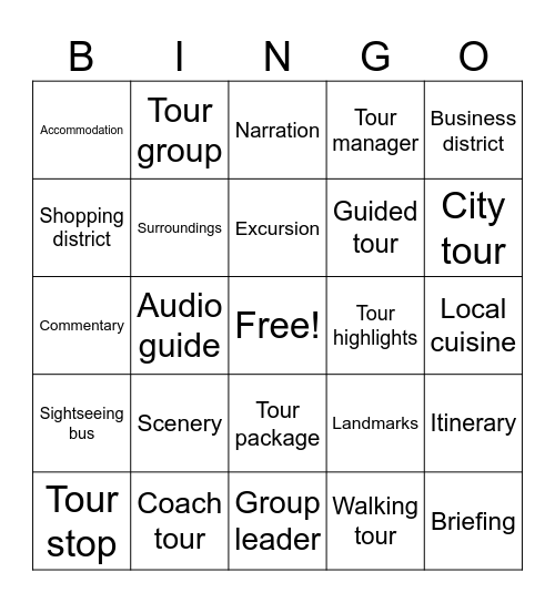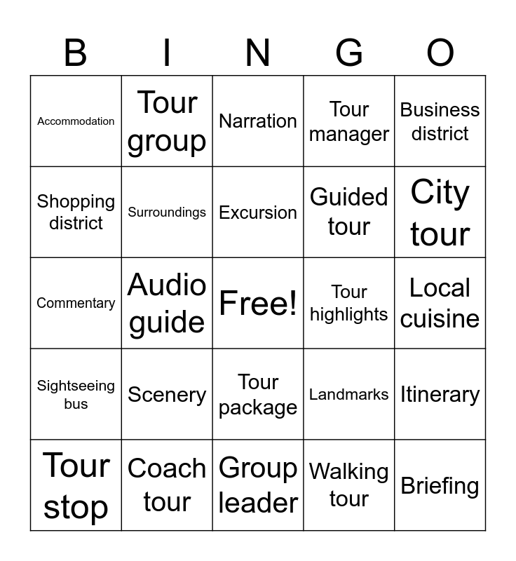 This bingo card has a free space and 24 words: Scenery, Coach tour, Excursion, Tour stop, Business district, Accommodation, Shopping district, Tour group, Tour highlights, Tour package, Guided tour, Commentary, Landmarks, Itinerary, Surroundings, Walking tour, Local cuisine, Narration, City tour, Audio guide, Briefing, Sightseeing bus, Tour manager and Group leader.