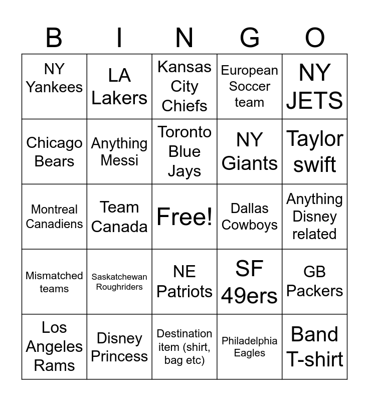 This bingo card has a free space and 24 words: Saskatchewan Roughriders, Disney Princess, Toronto Blue Jays, Los Angeles Rams, NY JETS, NY Yankees, Chicago Bears, LA Lakers, Dallas Cowboys, NE Patriots, NY Giants, Montreal Canadiens, SF 49ers, GB Packers, Anything Messi, Philadelphia Eagles, Anything Disney related, Kansas City Chiefs, Taylor swift, Team Canada, Band T-shirt, Mismatched teams, European Soccer team and Destination item (shirt, bag etc).