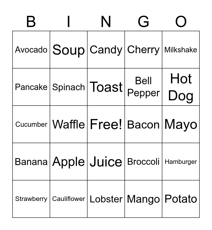 This bingo card has a free space and 65 words: Bread, Cereal, French Fries, Hamburger, Pizza, Sandwich, Soup, Spaghetti, Toast, Burrito, Juice, Ketchup, Mayo, Milkshake, Mustard, Pancake, Waffle, Avocado, Artichoke, Bell Pepper, Apple, Banana, Cherry, Fruit, Grapes, Melon, Peach, Pineapple, Potato, Salad, Strawberry, Tomato, Vegetable, Blackberry, Broccoli, Cauliflower, Corn, Cucumber, Mango, Pear, Spinach, String Beans, Bacon, Butter, Cheese, Egg, Hot Dog, Meat, Milk, Turkey, Clam, Crab, Lamb, Lobster, Pork, Shrimp, Fish, Candy, Chocolate, Cookie, Dessert, Ice Cream, Cake, Cupcake and Pie.