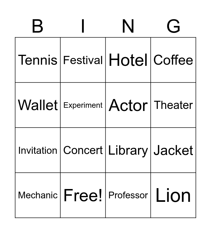 This bingo card has 28 words: Chocolate, Elephant, Invitation, Hospital, Experiment, Hotel, Festival, Lion, Free!, Zoo, Library, Coffee, Study, Calculator, Concert, Bee, Palace, Actor, Theater, Lamp, Tennis, Telephone, Mechanic, Jacket, Professor, Camera, Wallet and Computer.