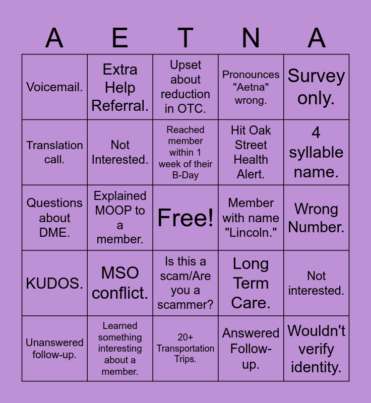 This bingo card has a free space and 24 words: MSO conflict., Learned something interesting about a member., Reached member within 1 week of their B-Day, Unanswered follow-up., Survey only., Voicemail., Translation call., Extra Help Referral., Member with name "Lincoln.", Is this a scam/Are you a scammer?, Hit Oak Street Health Alert., Questions about DME., Long Term Care., Not interested., Not Interested., Answered Follow-up., Wrong Number., Upset about reduction in OTC., 4 syllable name., Explained MOOP to a member., Wouldn't verify identity., KUDOS., Pronounces "Aetna" wrong. and 20+ Transportation Trips..
