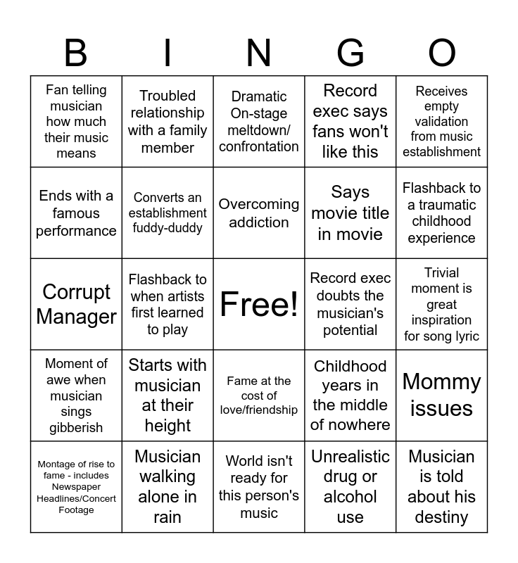 This bingo card has a free space and 34 words: Someone says "you have to hear this!", Unrealistic drug or alcohol use, Historical Cameo where they unnaturally say the full name of the person, Hater of Musician who is changes his tune when they hear a song, Moment of awe when musician sings gibberish, Converts an establishment fuddy-duddy, Receives empty validation from music establishment, Montage of rise to fame - includes Newspaper Headlines/Concert Footage, Troubled relationship with a family member, Troubled relationship with a significant other, Overcoming addiction, Dramatic On-stage meltdown/ confrontation, Reconciliation with family member set to famous song by musician, Mentor gives sage (but empty) advice, Record exec doubts the musician's potential, Flashback to a traumatic childhood experience, Musician walking alone in rain, Corrupt Manager, Starts with musician at their height, Childhood years in the middle of nowhere, Fame at the cost of love/friendship, Direct narrative metaphor with song playing in background, Fan telling musician how much their music means, Trivial moment is great inspiration for song lyric, World isn't ready for this person's music, Musician is told about his destiny, Record exec says fans won't like this, Trauma is used as motivation!, Says movie title in movie, Ends with a famous performance, Silent shocked awe at musician's music, Flashback to when artists first learned to play, Mommy issues and Daddy Issues.