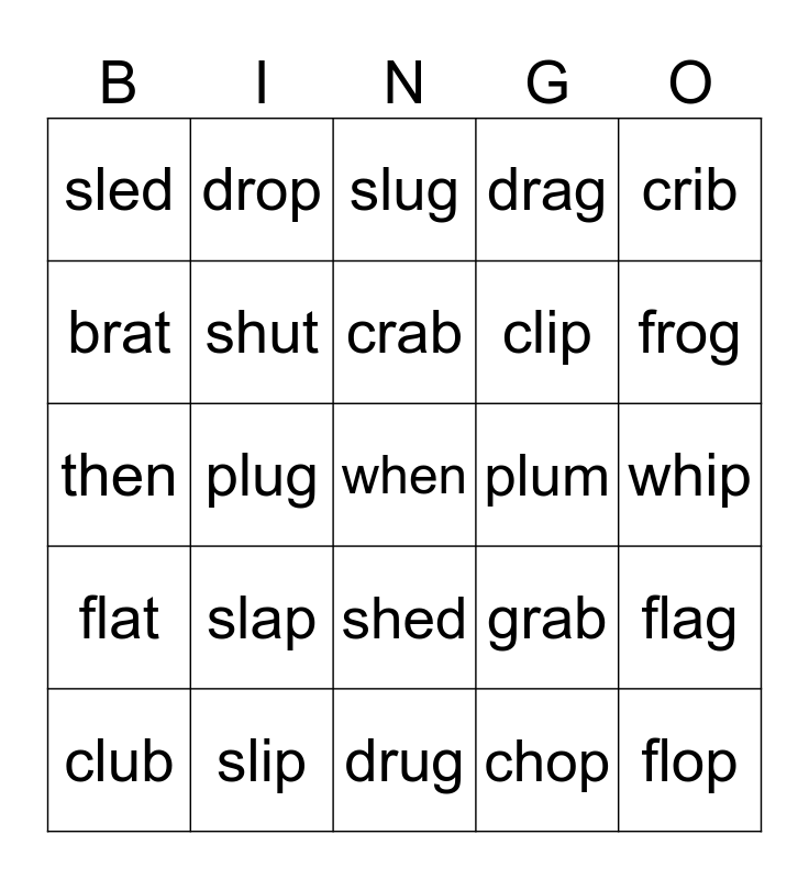 This bingo card has a free space and 24 words: slap, slip, crab, club, crib, sled, brat, drop, plum, shed, clip, then, grab, flag, shut, chop, whip, slug, frog, plug, flop, flat, drag and drug.
