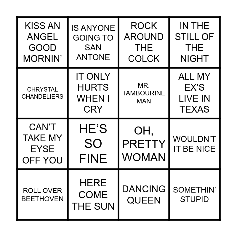 This bingo card has 26 words: MOVE IT ON OVER, COTTON JENNY, ALL MY EX’S LIVE IN TEXAS, FOUR STRONG WINDS, CHRYSTAL CHANDELIERS, KISS AN ANGEL GOOD MORNIN’, IT ONLY HURTS WHEN I CRY, IS ANYONE GOING TO SAN ANTONE, DANCING QUEEN, AND I LOVE YOU SO, CAN’T TAKE MY EYSE OFF YOU, OH, PRETTY WOMAN, I’VE GOT MY MIND SET ON YOU, SUGAR SUGAR, WOULDN’T IT BE NICE, WILL YOU LOVE ME TOMORROW, IN THE STILL OF THE NIGHT, SOMETHIN’ STUPID, ROCK AROUND THE COLCK, ROLL OVER BEETHOVEN, HE’S SO FINE, RUNAWAY, HERE COME THE SUN, THE LOCOMOTION, MR. TAMBOURINE MAN and SOMEDAY SOON.