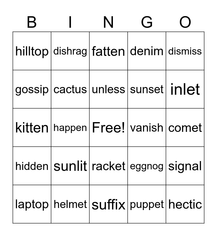 This bingo card has a free space and 25 words: sunlit, suffix, unless, laptop, dismiss, hilltop, gossip, dishrag, vanish, racket, sunset, kitten, eggnog, signal, cactus, rotten, comet, fatten, inlet, happen, hectic, helmet, hidden, denim and puppet.