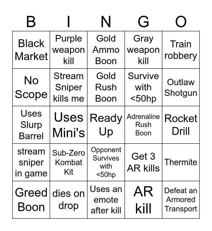 This bingo card has a free space and 58 words: use bandages, dies on drop, fall damage, stream sniper in game, AR kill, No shields before first fight, Stream Sniper kills me, get a win, Survive with <50hp, Gold AR, Gray weapon kill, 10 kills, die without a gun, get absolutely beamed, get killed by battlepass skin, Black Market, Defeat an Armored Transport, Train robbery, Vulture Boon, Gold Rush Boon, Adrenaline Rush Boon, Gold Ammo Boon, Greed Boon, Thermite, Plasma Burst Laser, Rocket Drill, Collateral Damage AR, Falcon Eye Sniper, Outlaw Shotgun, Collateral Damage AR kill, Falcon Eye Sniper kill, Outlaw Shotgun kill, The KNEECAPPER, Uses Port-A-Cover, Uses Pulse Scanner, Uses Med-Mist Grenade, Uses Gold Splash, Uses Mini's, Uses Slurp Barrel, Uses Med-Kit, Sub-Zero Kombat Kit, Get 3 Shotgun Kills, Get 3 AR kills, Explosive kill, SMG kill, No Shotgun in first building, Fishing, Opponent Survives with <50hp, Uses an emote after kill, Gets emoted on, TTV in Name, Mythical, Green weapon kill, Blue weapon kill, Purple weapon kill, Gold weapon kill, No Scope and Flopper used.