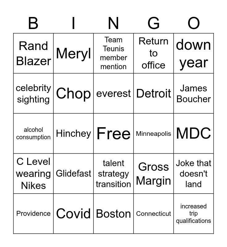 This bingo card has a free space and 24 words: Glidefast, Covid, everest, Providence, down year, Rand Blazer, celebrity sighting, Meryl, Minneapolis, talent strategy transition, Detroit, alcohol consumption, Gross Margin, Joke that doesn't land, Chop, Connecticut, MDC, Team Teunis member mention, James Boucher, Hinchey, increased trip qualifications, C Level wearing Nikes, Return to office and Boston.
