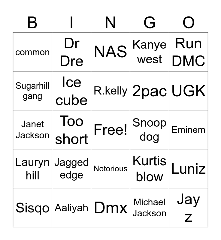 This bingo card has a free space and 24 words: Jagged edge, Aaliyah, R.kelly, Sisqo, Run DMC, common, Sugarhill gang, Dr Dre, Snoop dog, Notorious, 2pac, Janet Jackson, Kurtis blow, Luniz, Ice cube, Michael Jackson, Eminem, NAS, UGK, Too short, Jay z, Lauryn hill, Kanye west and Dmx.