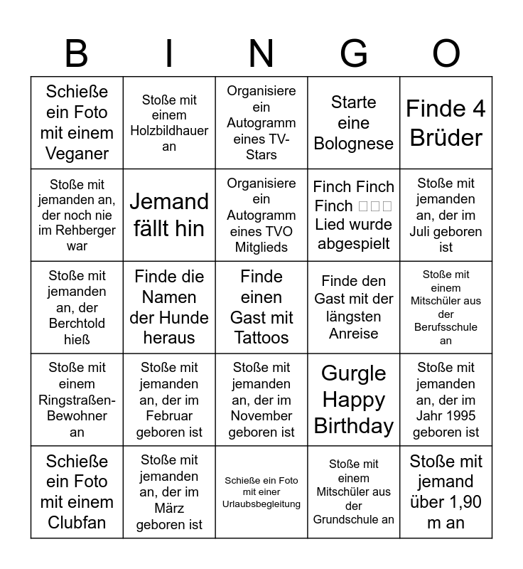 This bingo card has 55 words: Stoße mit Sonja an, Schieße ein Foto mit einem Clubfan, Schieße ein Foto mit dem Ersten auf der Tanzfläche, Schieße ein Foto mit einem Veganer, Schieße ein Foto mit einer Urlaubsbegleitung, Schieße ein Foto mit jemandem, der zum ersten Mal im Sportheim Gernach ist, Jemand fällt hin, Jemand schmeißt etwas herunter, Finch Finch Finch 𝅘𝅥𝅘𝅥𝅘𝅥 Lied wurde abgespielt, Jemand singt Happy Birthday, Starte eine Bolognese, Starte ein Limbo Turnier, Vollführe einen Tornado, Absolviere eine Lehre zum Heizungsbauer, Erforsche den Name des jüngsten Gastes, Bringe jemanden dazu, dir ein Getränk zu holen, Finde 4 Brüder, Finde die Namen der Hunde heraus, Finde einen Linkshänder, Finde einen Gast mit Tattoos, Finde den Gast mit der längsten Anreise, Suche einen regelmäßigen Festivalbesucher, Gurgle Happy Birthday, Organisiere ein Autogramm eines TV-Stars, Organisiere ein Autogramm eines Bandmitglieds, Organisiere ein Autogramm eines TVO Mitglieds, Stoße mit einem Mitschüler aus der Grundschule an, Stoße mit einem Mitschüler aus der Realschule an, Stoße mit einem Mitschüler aus der Berufsschule an, Stoße mit jemanden an, der im Jahr 1995 geboren ist, Stoße beiden Gästen an, die am 14.07 Geburtstag haben, Stoße beiden Gästen an, die am 24.03 Geburtstag haben, Stoße mit einem SKF-Mitarbeiter an, Stoße mit einem ehemaligen SKF-Mitarbeiter an, Stoße mit jemanden an, der noch nie im Rehberger war, Stoße mit jemanden an, der Berchtold hieß, Stoße mit jemanden an, der Berchtold heißt, Stoße mit einem Ringstraßen-Bewohner an, Stoße mit jemand über 1,90 m an, Stoße mit jemand an, der 2 verschiedene Socken trägt, Stoße mit einem Holzbildhauer an, Stoße mit jemanden an, der gelbe Socke trägt, Stoße mit jemanden an, der Selbstständig ist, Stoße mit jemanden an, der im Januar geboren ist, Stoße mit jemanden an, der im Februar geboren ist, Stoße mit jemanden an, der im März geboren ist, Stoße mit jemanden an, der im April geboren ist, Stoße mit jemanden an, der im Mai geboren ist, Stoße mit jemanden an, der im Juni geboren ist, Stoße mit jemanden an, der im Juli geboren ist, Stoße mit jemanden an, der im August geboren ist, Stoße mit jemanden an, der im September geboren ist, Stoße mit jemanden an, der im Oktober geboren ist, Stoße mit jemanden an, der im November geboren ist and Stoße mit jemanden an, der im Dezember geboren ist.