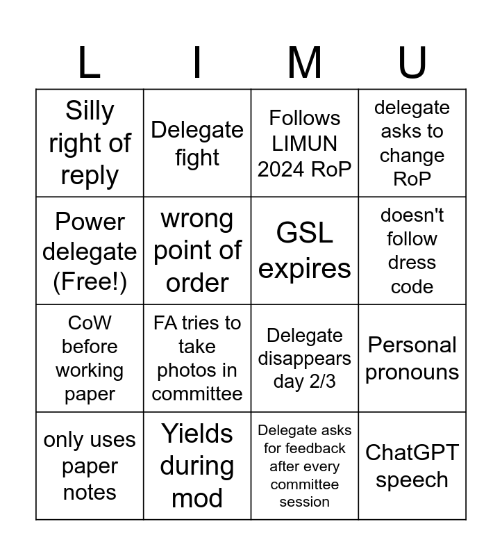 This bingo card has 16 words: Yields during mod, Personal pronouns, Follows LIMUN 2024 RoP, Silly right of reply, CoW before working paper, Delegate fight, Delegate disappears day 2/3, Delegate asks for feedback after every committee session, Power delegate (Free!), wrong point of order, only uses paper notes, delegate asks to change RoP, FA tries to take photos in committee, doesn't follow dress code, GSL expires and ChatGPT speech.