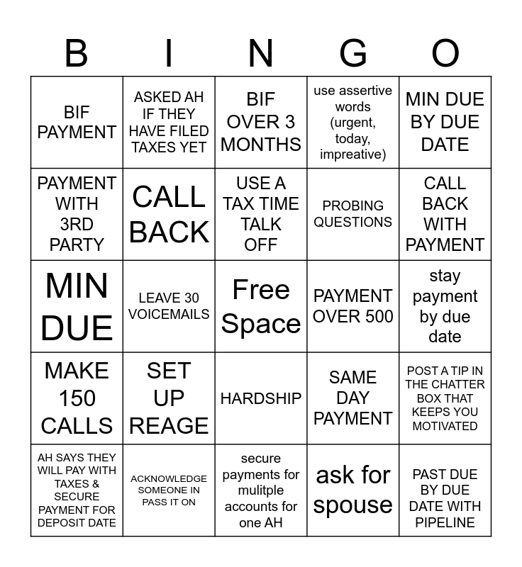 This bingo card has a free space and 24 words: SET UP REAGE, ACKNOWLEDGE SOMEONE IN PASS IT ON, USE A TAX TIME TALK OFF, AH SAYS THEY WILL PAY WITH TAXES & SECURE PAYMENT FOR DEPOSIT DATE, MIN DUE BY DUE DATE, BIF PAYMENT, PAYMENT WITH 3RD PARTY, ASKED AH IF THEY HAVE FILED TAXES YET, PAYMENT OVER 500, HARDSHIP, PROBING QUESTIONS, MIN DUE, SAME DAY PAYMENT, POST A TIP IN THE CHATTER BOX THAT KEEPS YOU MOTIVATED, CALL BACK, ask for spouse, stay payment by due date, BIF OVER 3 MONTHS, CALL BACK WITH PAYMENT, LEAVE 30 VOICEMAILS, PAST DUE BY DUE DATE WITH PIPELINE, MAKE 150 CALLS, use assertive words (urgent, today, impreative) and secure payments for mulitple accounts for one AH.