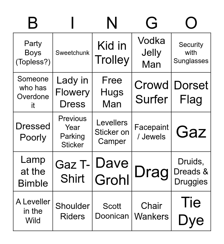 This bingo card has a free space and 24 words: Gaz T-Shirt, Shoulder Riders, Free Hugs Man, A Leveller in the Wild, Security with Sunglasses, Party Boys (Topless?), Someone who has Overdone it, Sweetchunk, Facepaint / Jewels, Dave Grohl, Crowd Surfer, Dressed Poorly, Drag, Druids, Dreads & Druggies, Lady in Flowery Dress, Chair Wankers, Gaz, Kid in Trolley, Dorset Flag, Previous Year Parking Sticker, Tie Dye, Lamp at the Bimble, Vodka Jelly Man and Scott Doonican.
