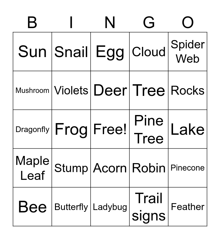 This bingo card has a free space and 24 words: Stump, Butterfly, Deer, Bee, Spider Web, Sun, Mushroom, Snail, Pine Tree, Acorn, Tree, Dragonfly, Robin, Pinecone, Violets, Trail signs, Lake, Egg, Rocks, Frog, Feather, Maple Leaf, Cloud and Ladybug.