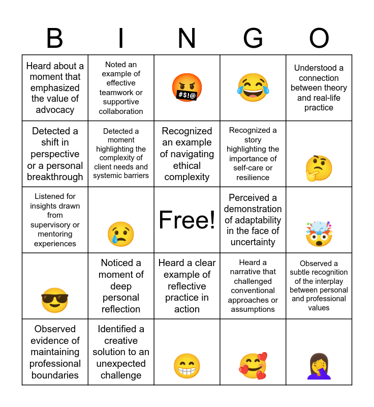 This bingo card has a free space and 24 words: Noticed a moment of deep personal reflection, Identified a creative solution to an unexpected challenge, Recognized an example of navigating ethical complexity, Observed evidence of maintaining professional boundaries, Understood a connection between theory and real-life practice, Heard about a moment that emphasized the value of advocacy, Detected a shift in perspective or a personal breakthrough, Noted an example of effective teamwork or supportive collaboration, Perceived a demonstration of adaptability in the face of uncertainty, Heard a clear example of reflective practice in action, Recognized a story highlighting the importance of self-care or resilience, Listened for insights drawn from supervisory or mentoring experiences, Heard a narrative that challenged conventional approaches or assumptions, Observed a subtle recognition of the interplay between personal and professional values, Detected a moment highlighting the complexity of client needs and systemic barriers, 🥰, 🤯, 🤬, 🤔, 😢, 🤦♀️, 😎, 😂 and 😁.