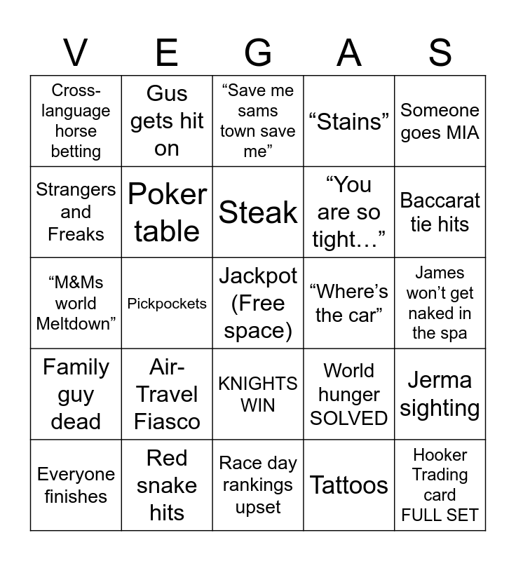 This bingo card has a free space and 24 words: Air-Travel Fiasco, Red snake hits, Steak, Everyone finishes, Someone goes MIA, Cross-language horse betting, Strangers and Freaks, Gus gets hit on, “Where’s the car”, KNIGHTS WIN, “You are so tight…”, “M&Ms world Meltdown”, World hunger SOLVED, Jerma sighting, Poker table, Tattoos, James won’t get naked in the spa, “Save me sams town save me”, Baccarat tie hits, Pickpockets, Hooker Trading card FULL SET, Family guy dead, “Stains” and Race day rankings upset.