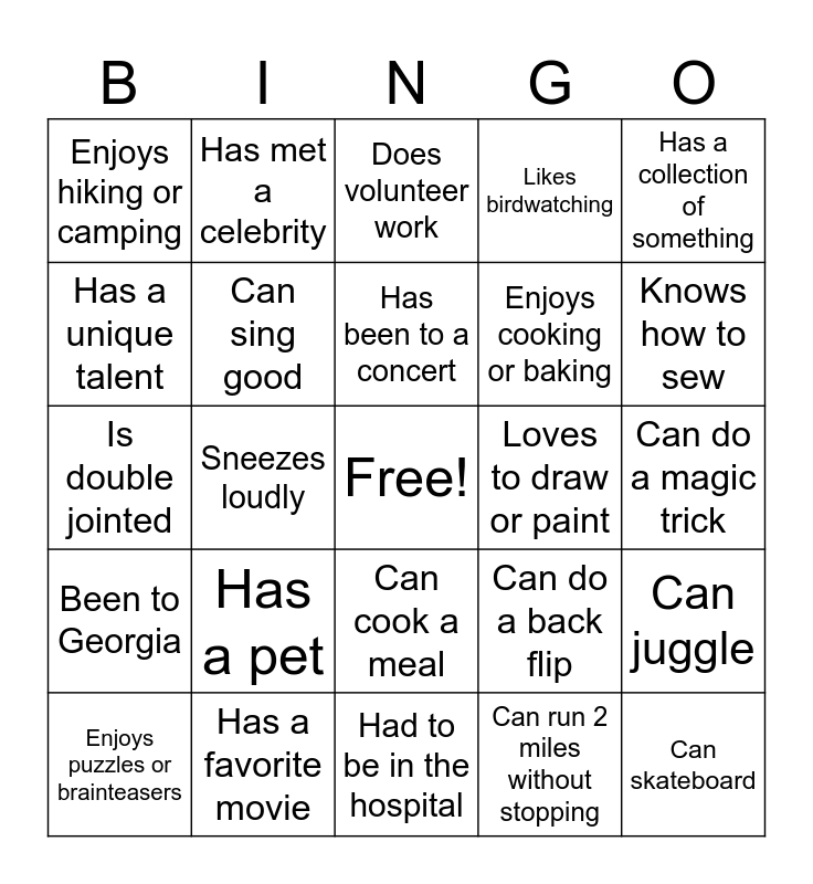 This bingo card has a free space and 24 words: Has a pet, Has a favorite movie, Has been to a concert, Enjoys puzzles or brainteasers, Has a collection of something, Enjoys hiking or camping, Has a unique talent, Has met a celebrity, Loves to draw or paint, Can cook a meal, Enjoys cooking or baking, Is double jointed, Can do a back flip, Can juggle, Can sing good, Can run 2 miles without stopping, Can do a magic trick, Does volunteer work, Knows how to sew, Sneezes loudly, Can skateboard, Been to Georgia, Likes birdwatching and Had to be in the hospital.