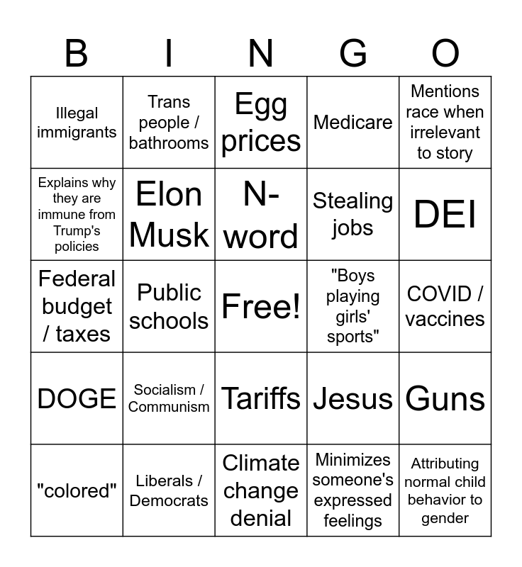 This bingo card has a free space and 24 words: Socialism / Communism, Liberals / Democrats, N-word, "colored", Mentions race when irrelevant to story, Illegal immigrants, Explains why they are immune from Trump's policies, Trans people / bathrooms, "Boys playing girls' sports", Tariffs, Stealing jobs, Federal budget / taxes, Jesus, Guns, Elon Musk, Minimizes someone's expressed feelings, COVID / vaccines, Egg prices, DEI, Public schools, Attributing normal child behavior to gender, DOGE, Medicare and Climate change denial.