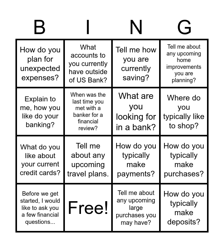 This bingo card has 16 words: Free!, How do you typically make purchases?, Tell me how you are currently saving?, How do you plan for unexpected expenses?, What do you like about your current credit cards?, What accounts to you currently have outside of US Bank?, How do you typically make payments?, Tell me about any upcoming large purchases you may have?, Explain to me, how you like do your banking?, When was the last time you met with a banker for a financial review?, Before we get started, I would like to ask you a few financial questions..., Tell me about any upcoming home improvements you are planning?, Tell me about any upcoming travel plans., Where do you typically like to shop?, What are you looking for in a bank? and How do you typically make deposits?.