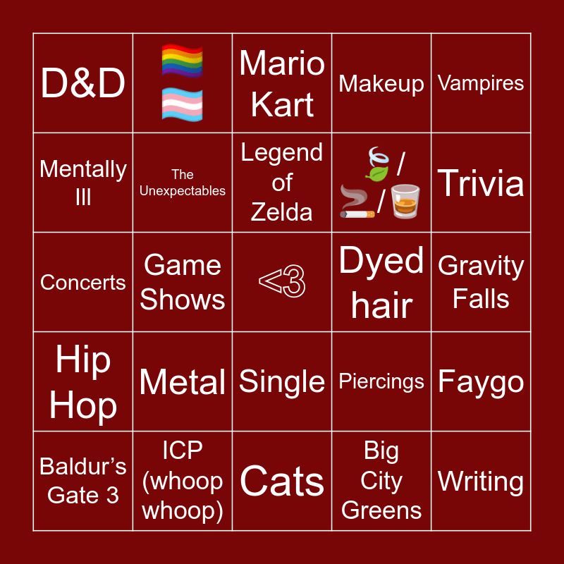 This bingo card has a free space and 24 words: Metal, ICP (whoop whoop), Legend of Zelda, Baldur’s Gate 3, Vampires, D&D, Mentally Ill, 🏳️🌈🏳️⚧️, Dyed hair, Single, 🍃/🚬/🥃, Concerts, Piercings, Faygo, The Unexpectables, Big City Greens, Gravity Falls, Mario Kart, Trivia, Game Shows, Writing, Hip Hop, Makeup and Cats.