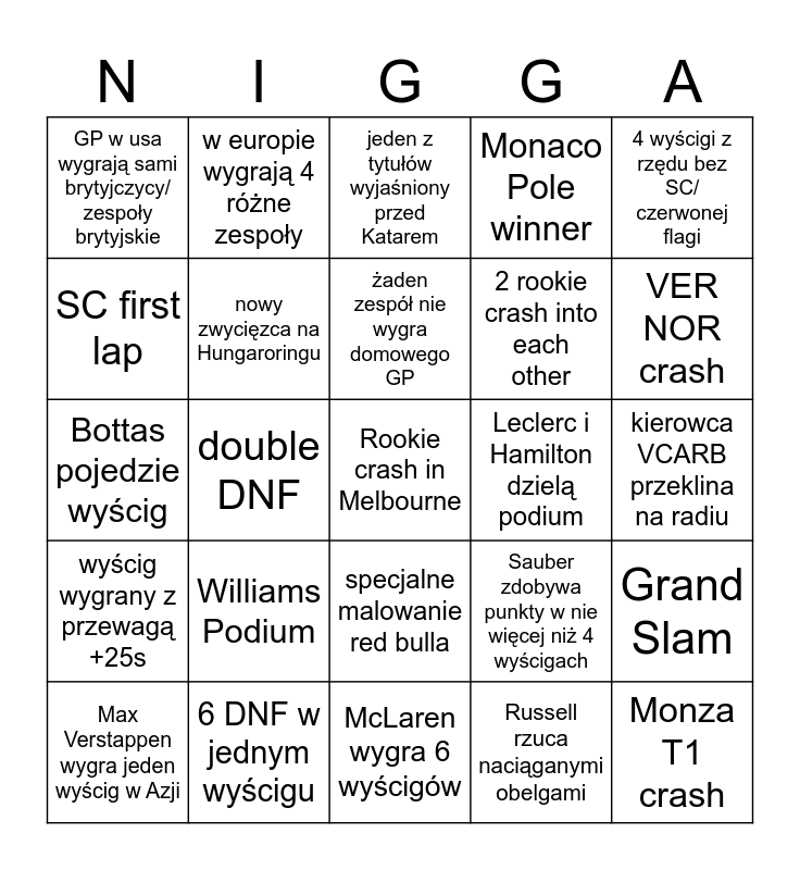 This bingo card has a free space and 24 words: Williams Podium, 6 DNF w jednym wyścigu, żaden zespół nie wygra domowego GP, Max Verstappen wygra jeden wyścig w Azji, 4 wyścigi z rzędu bez SC/ czerwonej flagi, GP w usa wygrają sami brytyjczycy/ zespoły brytyjskie, SC first lap, w europie wygrają 4 różne zespoły, Leclerc i Hamilton dzielą podium, specjalne malowanie red bulla, 2 rookie crash into each other, Bottas pojedzie wyścig, Sauber zdobywa punkty w nie więcej niż 4 wyścigach, Grand Slam, nowy zwycięzca na Hungaroringu, Russell rzuca naciąganymi obelgami, kierowca VCARB przeklina na radiu, jeden z tytułów wyjaśniony przed Katarem, VER NOR crash, double DNF, Monza T1 crash, wyścig wygrany z przewagą +25s, Monaco Pole winner and McLaren wygra 6 wyścigów.