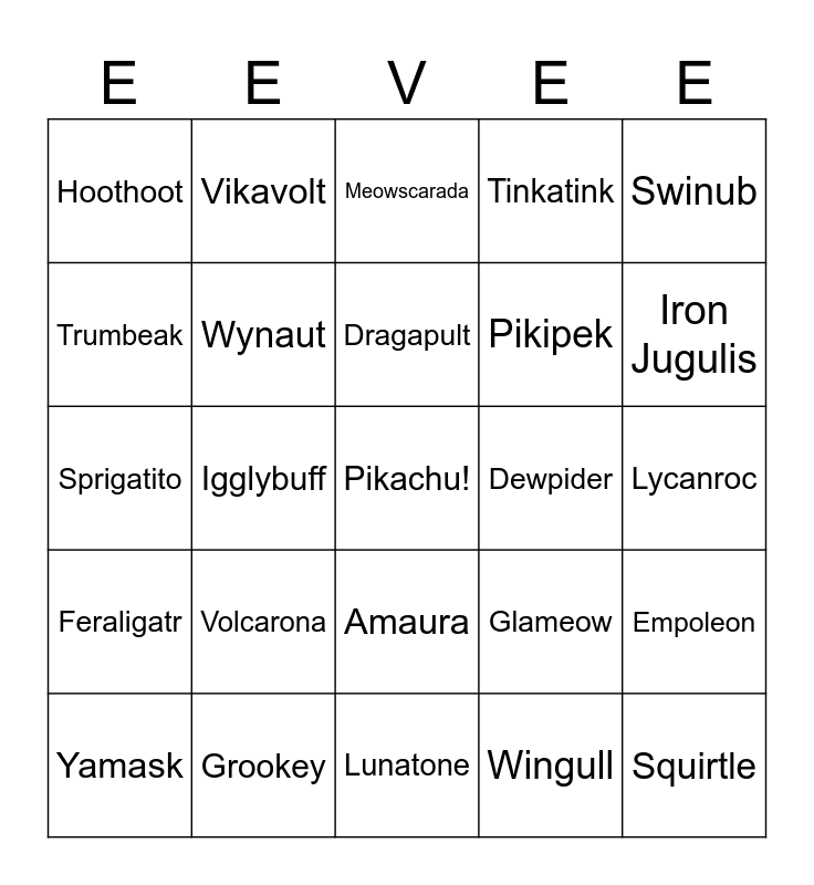 This bingo card has a free space and 24 words: Volcarona, Grookey, Dragapult, Yamask, Swinub, Hoothoot, Trumbeak, Vikavolt, Dewpider, Amaura, Pikipek, Sprigatito, Glameow, Empoleon, Wynaut, Wingull, Lycanroc, Meowscarada, Iron Jugulis, Igglybuff, Squirtle, Feraligatr, Tinkatink and Lunatone.