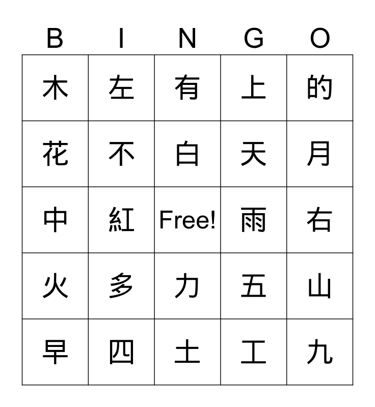 This bingo card has a free space and 24 words: 多, 四, 白, 早, 的, 木, 花, 左, 雨, 力, 天, 中, 五, 山, 不, 工, 右, 有, 月, 紅, 九, 火, 上 and 土.