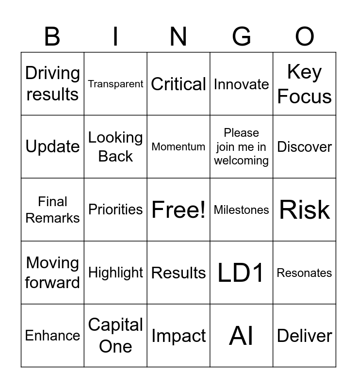 This bingo card has a free space and 27 words: LD1, Deep Dive, Please join me in welcoming, Impact, Update, Critical, Transparent, Moving forward, Milestones, Resonates, Final Remarks, Innovate, Enhance, Capital One, Discover, DEI, Looking Back, Momentum, Highlight, Driving results, Risk, AI, Priorities, Deliver, Results, Key Focus and Navigates.