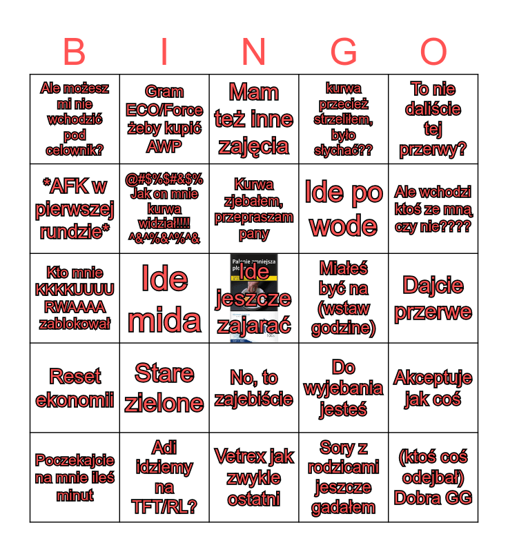 This bingo card has a free space and 28 words: Akceptuje jak coś, W ostatnim momencie kliknąłem, Ide po wode, Sory z rodzicami jeszcze gadałem, *AFK w pierwszej rundzie*, Mam też inne zajęcia, Gram ECO/Force żeby kupić AWP, Reset ekonomii, Miałeś być na (wstaw godzine), Poczekajcie na mnie ileś minut, Kto mnie KKKKUUUU RWAAAA zablokował, kurwa przecież strzeliłem, było słychać??, Adi idziemy na TFT/RL?, Vetrex jak zwykle ostatni, Ale wchodzi ktoś ze mną czy nie????, Daje flesza, peakuj rampe, Stare zielone, @#$%$#&$% Jak on mnie kurwa widział!!!! ^&^%&^%^&, Kurwa zjebałem, przepraszam pany, No, to zajebiście, Ale możesz mi nie wchodzić pod celownik?, Daj AWP, (ktoś coś odejbał) Dobra GG, Ide mida, Dajcie przerwe, Do wyjebania jesteś, To nie daliście tej przerwy? and clutch or gay.