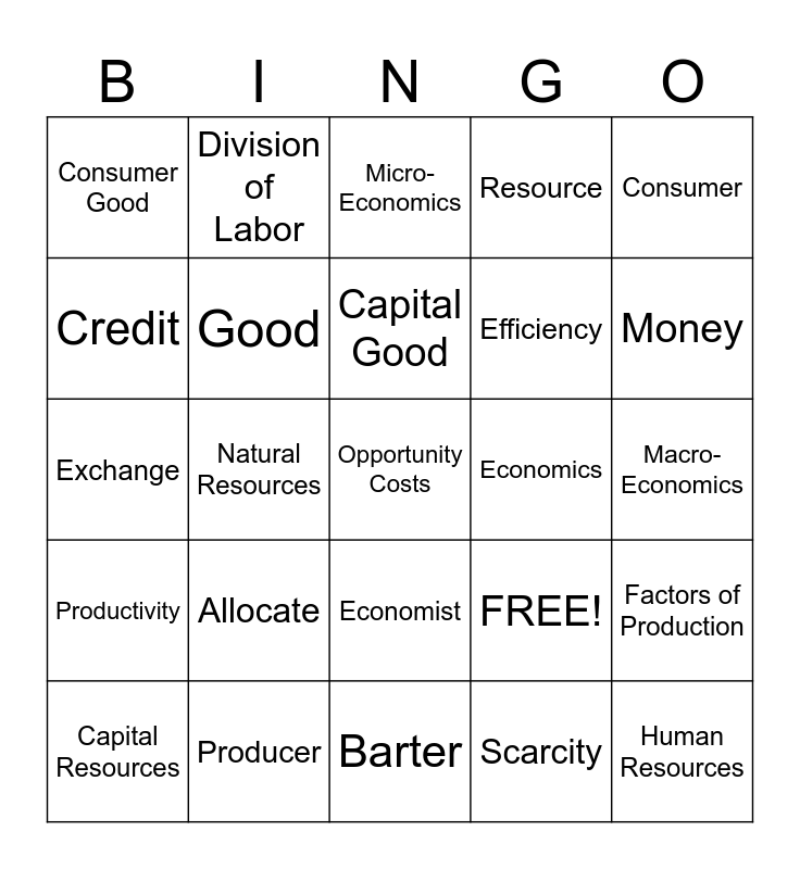 This bingo card has 25 words: Allocate, Barter, Capital Good, Capital Resources, Consumer, Consumer Good, Credit, Division of Labor, Economics, Economist, Efficiency, Exchange, FREE!, Factors of Production, Good, Human Resources, Macro-Economics, Micro- Economics, Money, Natural Resources, Opportunity Costs, Producer, Productivity, Resource and Scarcity.