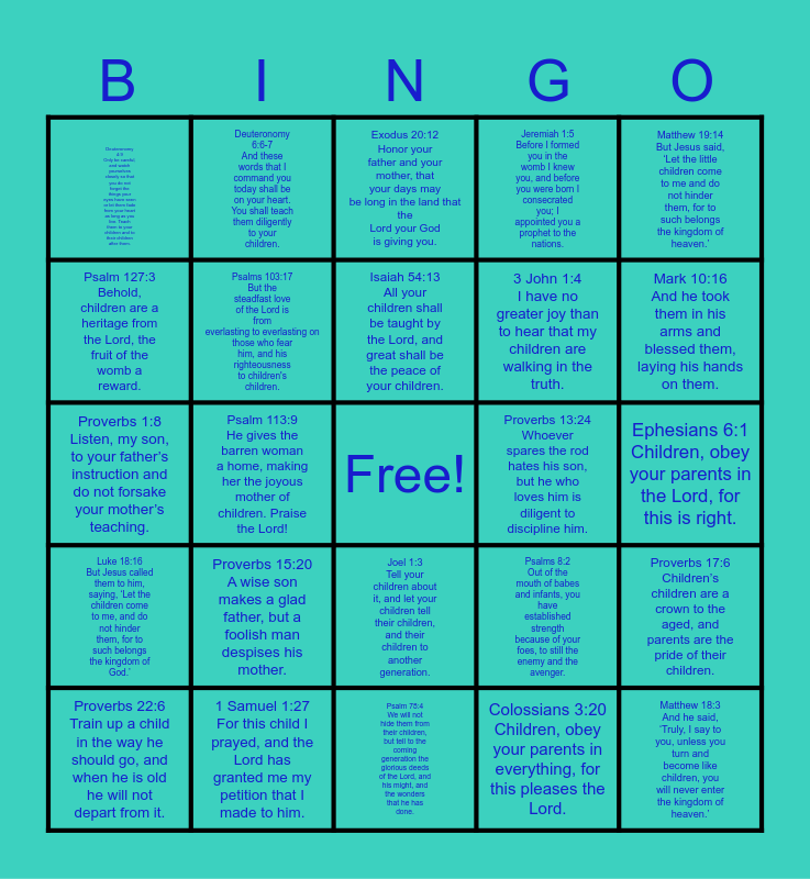 This bingo card has a free space and 24 words: Proverbs 15:20 A wise son makes a glad father, but a foolish man despises his mother., 1 Samuel 1:27 For this child I prayed, and the Lord has granted me my petition that I made to him., Isaiah 54:13 All your children shall be taught by the Lord, and great shall be the peace of your children., Proverbs 22:6 Train up a child in the way he should go, and when he is old he will not depart from it., Matthew 19:14 But Jesus said, ‘Let the little children come to me and do not hinder them, for to such belongs the kingdom of heaven.’, Deuteronomy 4:9 Only be careful, and watch yourselves closely so that you do not forget the things your eyes have seen or let them fade from your heart as long as you live. Teach them to your children and to their children after them., Psalm 127:3 Behold, children are a heritage from the Lord, the fruit of the womb a reward., Deuteronomy 6:6-7 And these words that I command you today shall be on your heart. You shall teach them diligently to your children., Proverbs 13:24 Whoever spares the rod hates his son, but he who loves him is diligent to discipline him., Joel 1:3 Tell your children about it, and let your children tell their children, and their children to another generation., 3 John 1:4 I have no greater joy than to hear that my children are walking in the truth., Proverbs 1:8 Listen, my son, to your father’s instruction and do not forsake your mother’s teaching., Psalms 8:2 Out of the mouth of babes and infants, you have established strength because of your foes, to still the enemy and the avenger., Proverbs 17:6 Children’s children are a crown to the aged, and parents are the pride of their children., Psalms 103:17 But the steadfast love of the Lord is from everlasting to everlasting on those who fear him, and his righteousness to children's children., Colossians 3:20 Children, obey your parents in everything, for this pleases the Lord., Ephesians 6:1 Children, obey your parents in the Lord, for this is right., Exodus 20:12 Honor your father and your mother, that your days may be long in the land that the Lord your God is giving you., Mark 10:16 And he took them in his arms and blessed them, laying his hands on them., Psalm 113:9 He gives the barren woman a home, making her the joyous mother of children. Praise the Lord!, Matthew 18:3 And he said, ‘Truly, I say to you, unless you turn and become like children, you will never enter the kingdom of heaven.’, Luke 18:16 But Jesus called them to him, saying, ‘Let the children come to me, and do not hinder them, for to such belongs the kingdom of God.’, Jeremiah 1:5 Before I formed you in the womb I knew you, and before you were born I consecrated you; I appointed you a prophet to the nations. and Psalm 78:4 We will not hide them from their children, but tell to the coming generation the glorious deeds of the Lord, and his might, and the wonders that he has done..