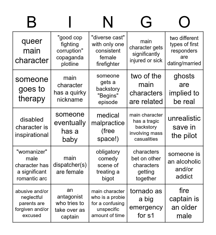 This bingo card has a free space and 24 words: main dispatcher(s) are female, an antagonist who tries to take over as captain, someone gets a backstory "Begins" episode, abusive and/or neglectful parents are forgiven and/or excused, two different types of first responders are dating/married, queer main character, someone goes to therapy, "good cop fighting corruption" copaganda plotline, main character has a tragic backstory involving mass casualities, obligatory comedy scene of treating a bigot, two of the main characters are related, disabled character is inspirational, characters bet on other characters getting together, someone is an alcoholic and/or addict, main character has a quirky nickname, tornado as a big emergency for s1, unrealistic save in the pilot, "diverse cast" with only one consistent female firefighter, ghosts are implied to be real, someone eventually has a baby, fire captain is an older male, "womanizer" male character has a significant romantic arc, main character gets significantly injured or sick and main character who is a probie for a confusing unspecific amount of time.