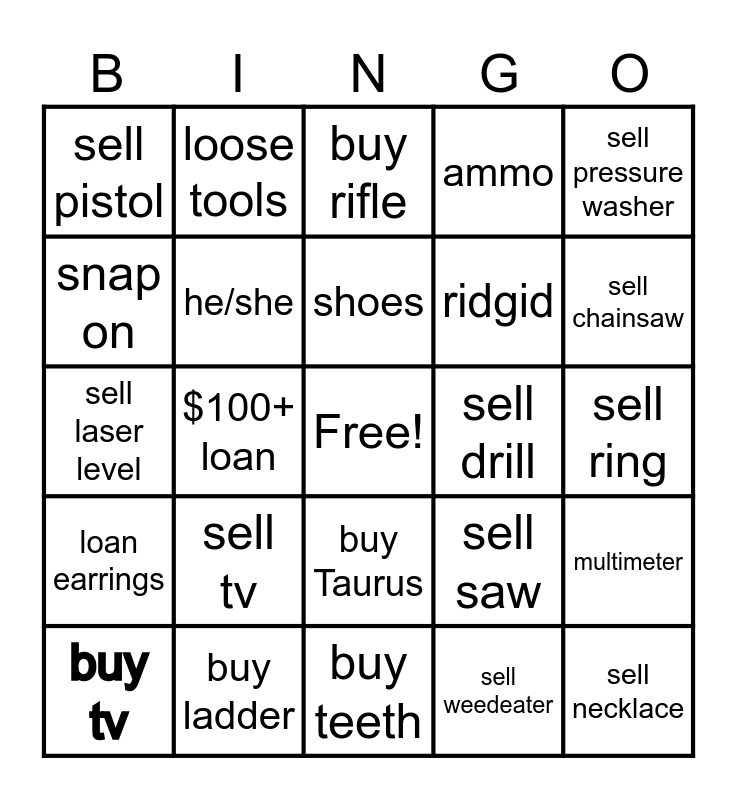 This bingo card has a free space and 29 words: buy tv, glock, $100+ loan, $125+ sale, sell pistol, buy rifle, he/she, sell tv, sell drill, buy ladder, sell ring, sell necklace, buy teeth, sell weedeater, sell chainsaw, sell PS5, buy Taurus, loan earrings, sell pressure washer, sell laser level, sell saw, ryobi, ridgid, snap on, ammo, loose tools, multimeter, shoes and fan.