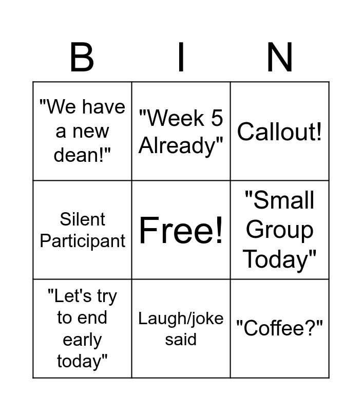 This bingo card has a free space and 8 words: "Small Group Today", Callout!, "Week 5 Already", "Let's try to end early today", "We have a new dean!", "Coffee?", Silent Participant and Laugh/joke said.