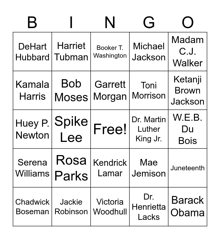 This bingo card has a free space and 24 words: Rosa Parks, Jackie Robinson, Garrett Morgan, Chadwick Boseman, Madam C.J. Walker, DeHart Hubbard, Kamala Harris, Harriet Tubman, Dr. Martin Luther King Jr., Kendrick Lamar, Toni Morrison, Huey P. Newton, Mae Jemison, Juneteenth, Bob Moses, Dr. Henrietta Lacks, W.E.B. Du Bois, Booker T. Washington, Ketanji Brown Jackson, Spike Lee, Barack Obama, Serena Williams, Michael Jackson and Victoria Woodhull.