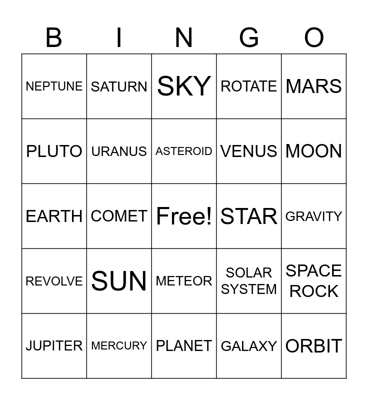 This bingo card has a free space and 24 words: SUN, MERCURY, ASTEROID, JUPITER, MARS, NEPTUNE, PLUTO, SATURN, STAR, METEOR, VENUS, EARTH, SOLAR SYSTEM, SPACE ROCK, URANUS, GALAXY, GRAVITY, SKY, MOON, COMET, ORBIT, REVOLVE, ROTATE and PLANET.