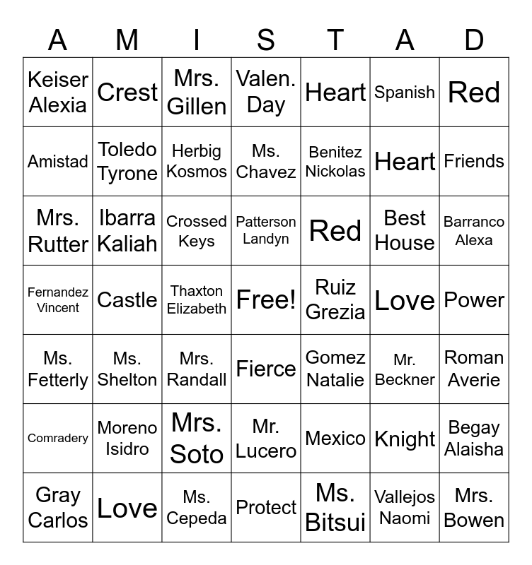 This bingo card has a free space and 48 words: Mexico, Heart, Protect, Castle, Crossed Keys, Power, Crest, Love, Spanish, Fierce, Red, Valen. Day, Best House, Red, Comradery, Love, Amistad, Friends, Knight, Heart, Benitez Nickolas, Thaxton Elizabeth, Keiser Alexia, Toledo Tyrone, Begay Alaisha, Herbig Kosmos, Barranco Alexa, Gray Carlos, Patterson Landyn, Ibarra Kaliah, Vallejos Naomi, Ruiz Grezia, Roman Averie, Moreno Isidro, Fernandez Vincent, Gomez Natalie, Mr. Beckner, Mrs. Rutter, Mrs. Randall, Mrs. Soto, Ms. Fetterly, Mrs. Bowen, Mrs. Gillen, Ms. Cepeda, Ms. Chavez, Mr. Lucero, Ms. Shelton and Ms. Bitsui.