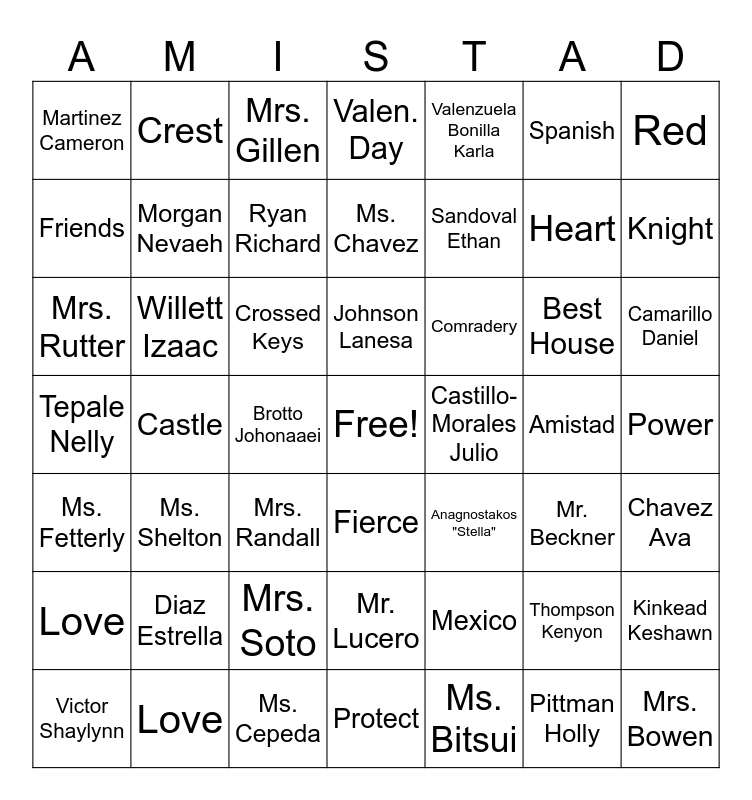 This bingo card has a free space and 48 words: Mexico, Heart, Protect, Castle, Crossed Keys, Power, Crest, Love, Spanish, Fierce, Red, Valen. Day, Best House, Comradery, Love, Amistad, Friends, Knight, Thompson Kenyon, Valenzuela Bonilla Karla, Sandoval Ethan, Brotto Johonaaei, Martinez Cameron, Morgan Nevaeh, Kinkead Keshawn, Ryan Richard, Camarillo Daniel, Victor Shaylynn, Johnson Lanesa, Willett Izaac, Pittman Holly, Castillo-Morales Julio, Chavez Ava, Diaz Estrella, Tepale Nelly, Anagnostakos "Stella", Mr. Beckner, Mrs. Rutter, Mrs. Randall, Mrs. Soto, Ms. Fetterly, Mrs. Bowen, Mrs. Gillen, Ms. Cepeda, Ms. Chavez, Mr. Lucero, Ms. Shelton and Ms. Bitsui.
