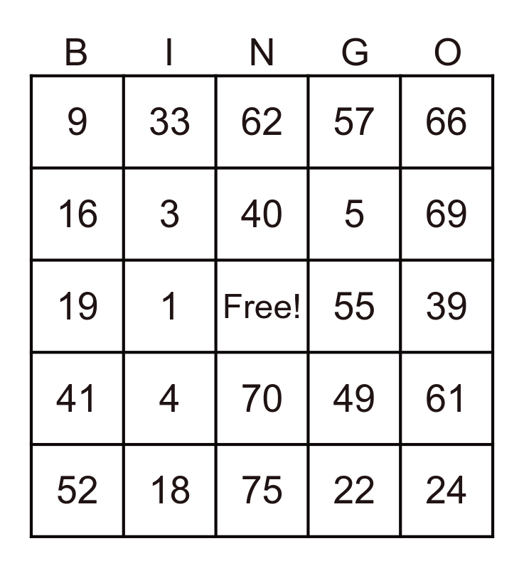 This bingo card has a free space and 24 words: 4, 18, 40, 52, 66, 9, 16, 33, 55, 70, 5, 19, 49, 61, 3, 22, 39, 62, 69, 1, 24, 41, 57 and 75.