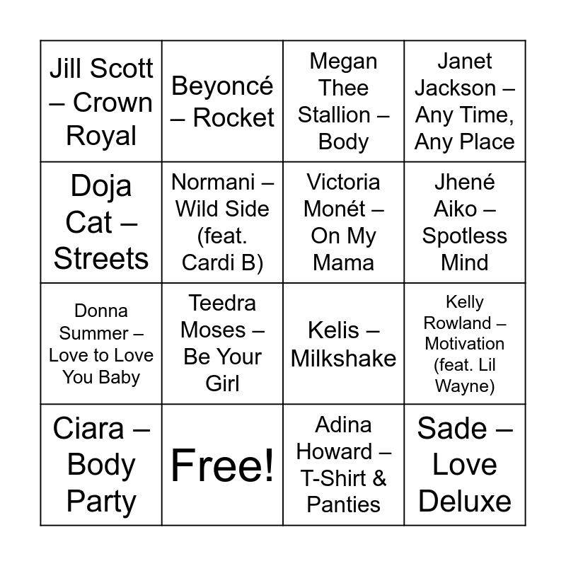 This bingo card has 21 words: Free!, Janet Jackson – Would You Mind, Beyoncé – Rocket, Floetry – Say Yes, Adina Howard – T-Shirt & Panties, Victoria Monét – On My Mama, Jill Scott – Crown Royal, Megan Thee Stallion – Body, Kelis – Milkshake, Jhené Aiko – Spotless Mind, Donna Summer – Love to Love You Baby, Janet Jackson – Any Time, Any Place, Sade – Love Deluxe, Summer Walker – Session 32, Normani – Wild Side (feat. Cardi B), Tinashe – Touch & Go (feat. 6LACK), Ciara – Body Party, Teedra Moses – Be Your Girl, Doja Cat – Streets, Kelly Rowland – Motivation (feat. Lil Wayne) and FKA twigs – Two Weeks.