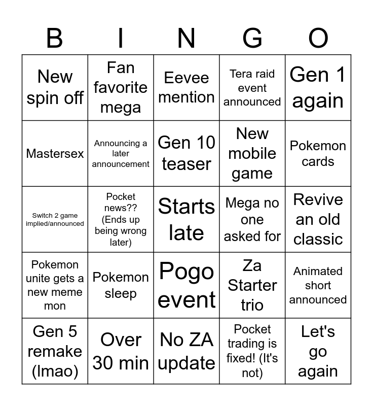 This bingo card has 25 words: Pokemon sleep, No ZA update, Gen 10 teaser, Gen 5 remake (lmao), Gen 1 again, New spin off, Mastersex, Fan favorite mega, Mega no one asked for, Pogo event, New mobile game, Switch 2 game implied/announced, Za Starter trio, Animated short announced, Announcing a later announcement, Let's go again, Revive an old classic, Eevee mention, Pokemon cards, Pocket news?? (Ends up being wrong later), Starts late, Over 30 min, Pokemon unite gets a new meme mon, Tera raid event announced and Pocket trading is fixed! (It's not).
