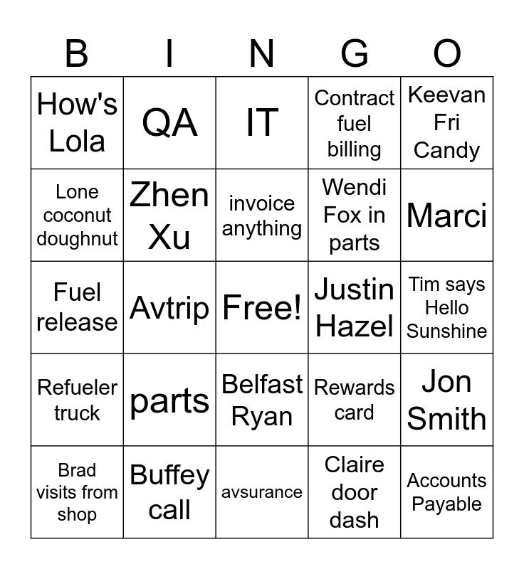 This bingo card has a free space and 25 words: parts, avsurance, invoice anything, Brad visits from shop, Keevan Fri Candy, How's Lola, Lone coconut doughnut, QA, Justin Hazel, Belfast Ryan, Wendi Fox in parts, Fuel release, Rewards card, Jon Smith, Zhen Xu, Avplan, Tim says Hello Sunshine, IT, Marci, Avtrip, Accounts Payable, Buffey call, Refueler truck, Contract fuel billing and Claire door dash.