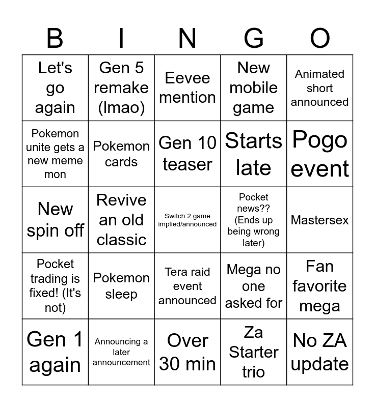 This bingo card has 25 words: Pokemon sleep, Over 30 min, Gen 10 teaser, Gen 1 again, Animated short announced, Let's go again, Pokemon unite gets a new meme mon, Gen 5 remake (lmao), Pocket news?? (Ends up being wrong later), Tera raid event announced, Starts late, New spin off, Mega no one asked for, Fan favorite mega, Pokemon cards, No ZA update, Mastersex, Eevee mention, Pogo event, Revive an old classic, Switch 2 game implied/announced, Announcing a later announcement, Pocket trading is fixed! (It's not), New mobile game and Za Starter trio.